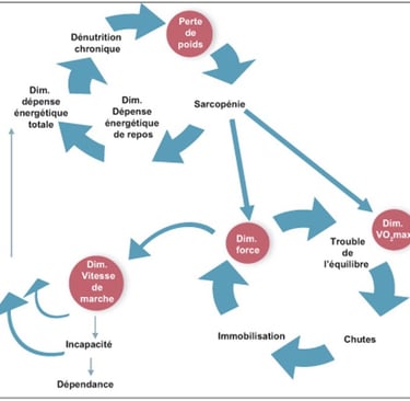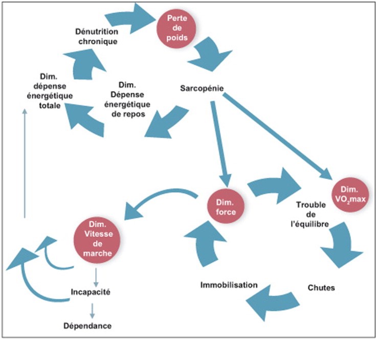 On peut considérer, selon cet auteur, la sarcopénie (perte de force et de masse musculaire) comme le premier responsable de la fragilisation et les troubles de l’équilibre comme le facteur de risque le plus susceptible de faire basculer une personne fragile dans un état d’incapacité et de dépendance (Mourey, 2010).